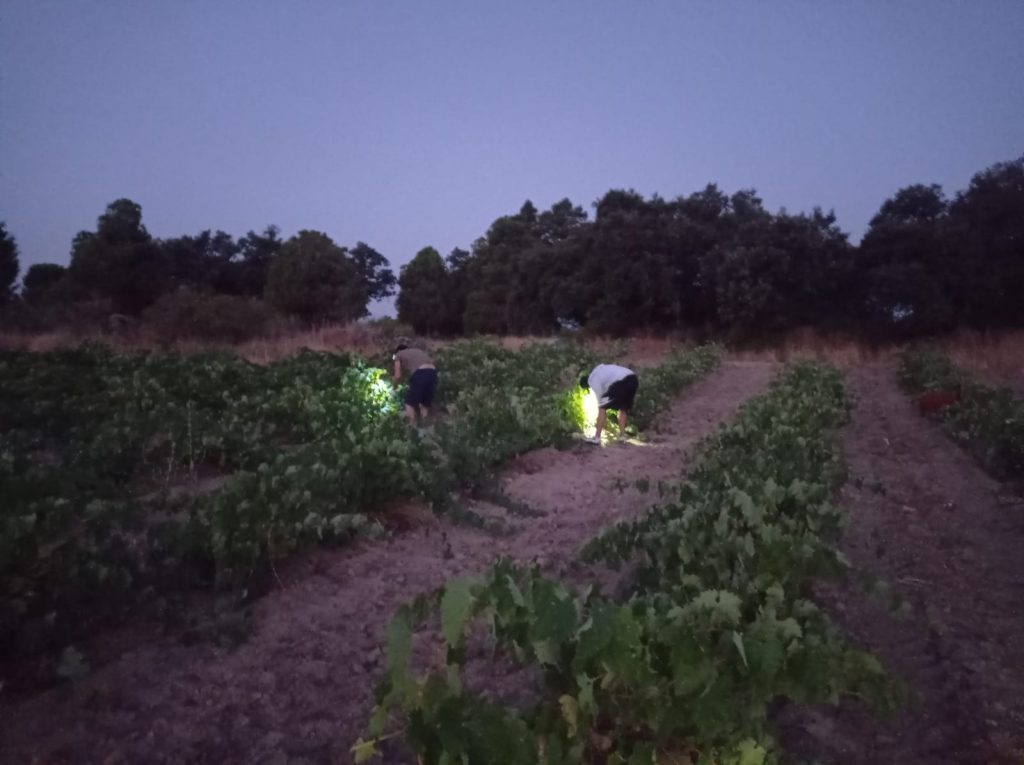Comienza al amanecer, a las cinco de la mañana, para preservar la calidad de la uva. Se lleva a cabo una cuidadosa selección de racimos en campo y en mesa, antes de que entren en bodega, garantizando así el respeto por el fruto y su estado sanitario.