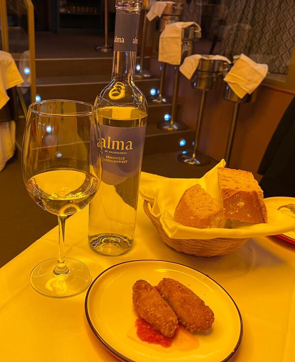 Y, por supuesto, no puede faltar un buen vino. Si es de Madrid, el Alma de Valdeguerra, un blanco semi dulce de la DO Vinos de Madrid muy reconocido, es perfecto para acompañar las croquetas y la sopa. Un tinto de su magnífica carta es ideal para degustar el tercer vuelco.