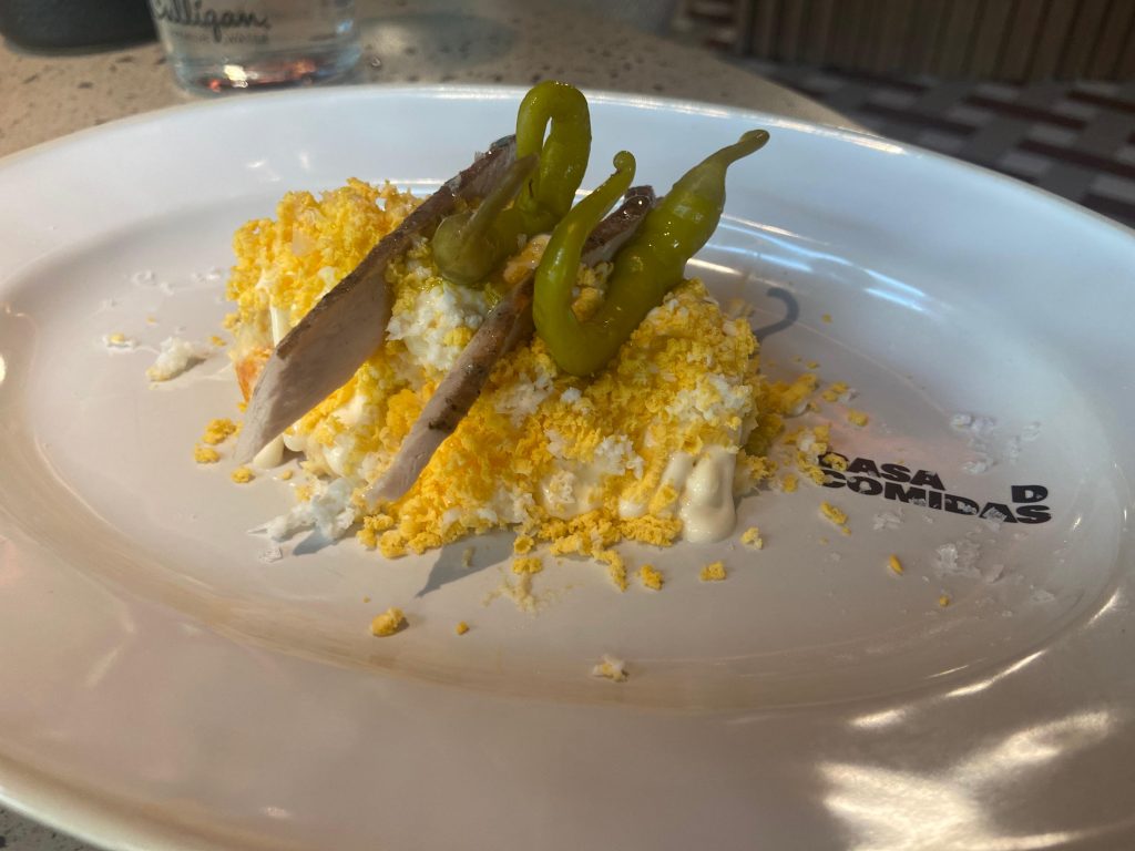 Entre sus platos más madrileños brillan los huevos a la mimosa, la ensaladilla rusa con ventresca de atún, los clásicos boquerones en vinagre y su refrescante cóctel ‘Agua de Madrid’, una bebida chispeante que resume el carácter disfrutón de la capital: cerveza, vermú blanco, licor Italicus de bergamota, cordial de lima y hierbabuena.