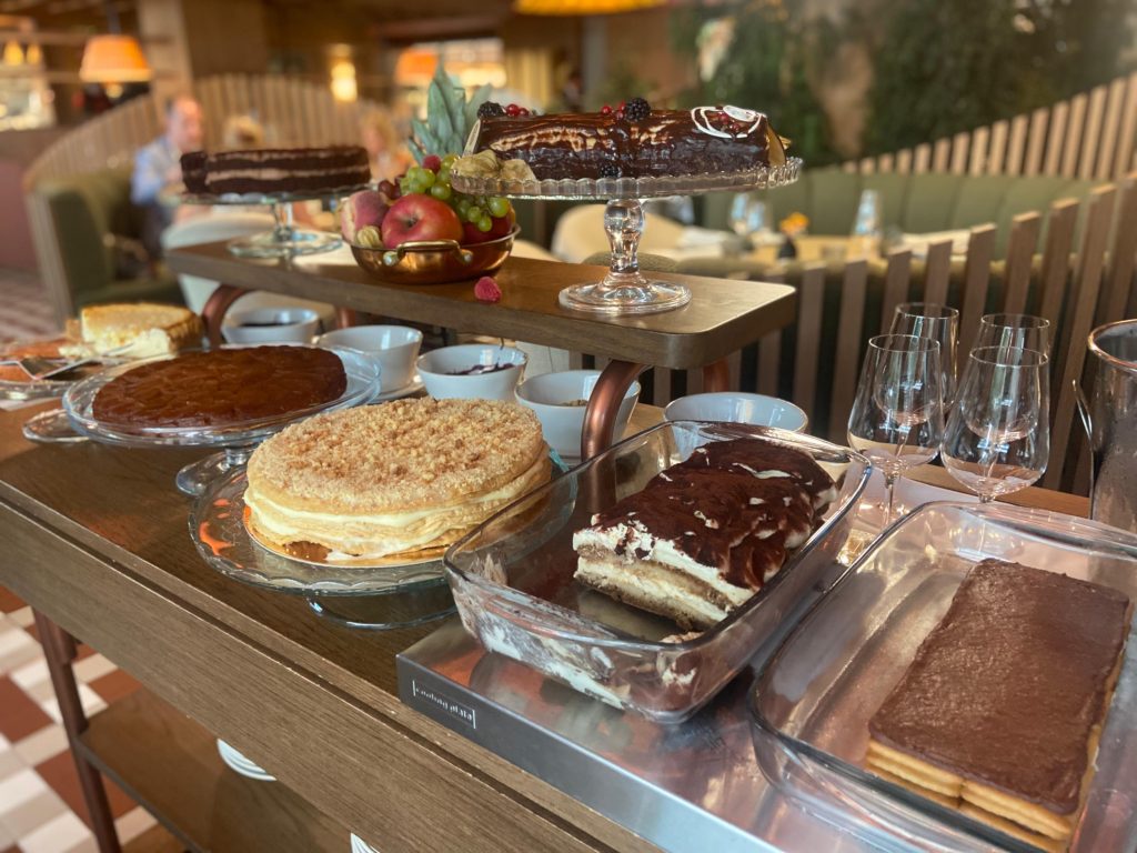 Y cuando la comida parece haber alcanzado su punto culminante, llega el carrito de postres, una fantasía dulce que recorre el salón como un desfile irresistible.