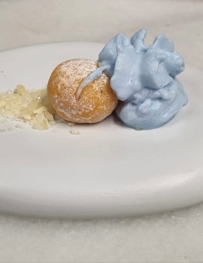 En el Gran Hotel Inglés, las yemas de Santa Teresa se visten de espuma de violetas y petazetas, un guiño dulce a los sabores de la infancia, con las tradicionales violetas madrileñas como protagonistas.