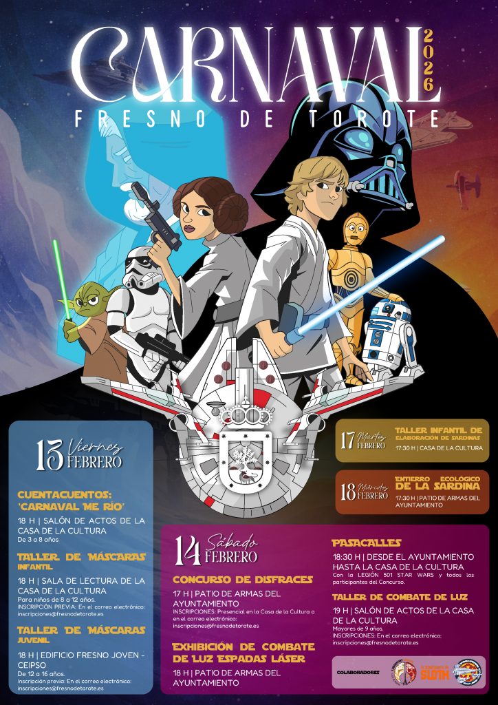 El Ayuntamiento de Fresno de Torote celebra el Carnaval 2026, que este año tomará como eje temático la icónica saga cinematográfica Star Wars. La festividad se extenderá del 13 al 18 de febrero, ofreciendo un programa de actividades diseñado para el disfrute de todos los vecinos, desde los más pequeños hasta los adultos.